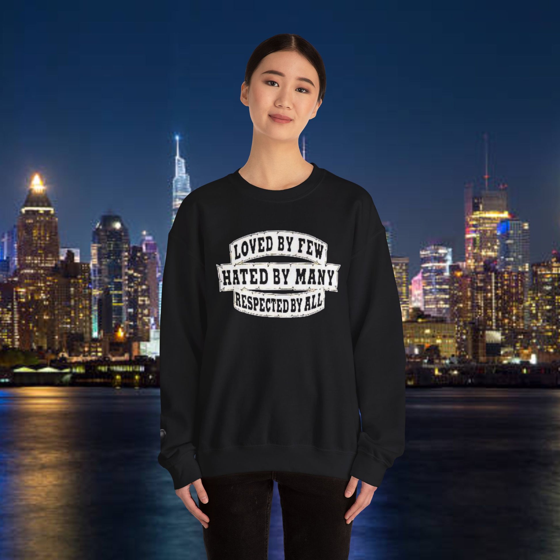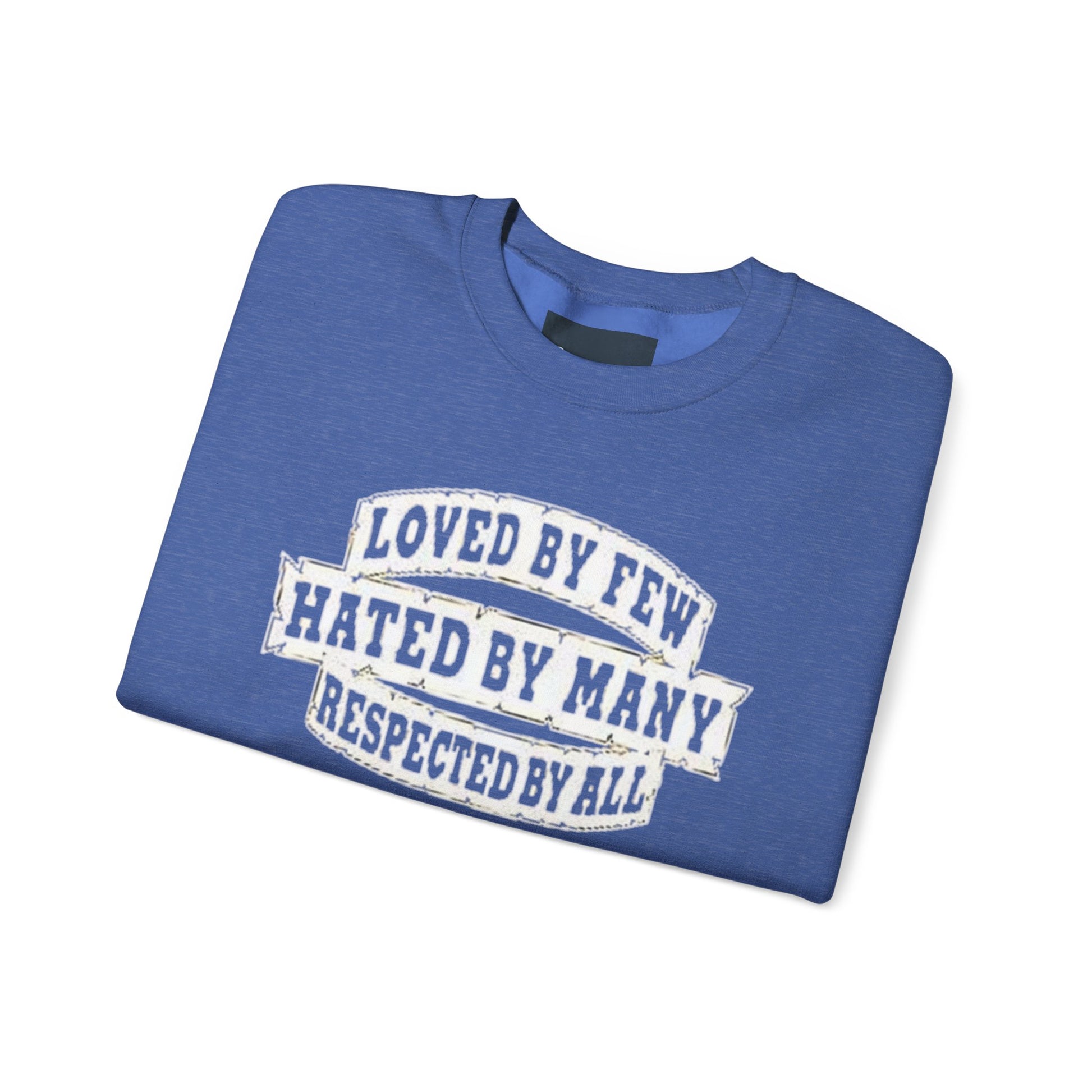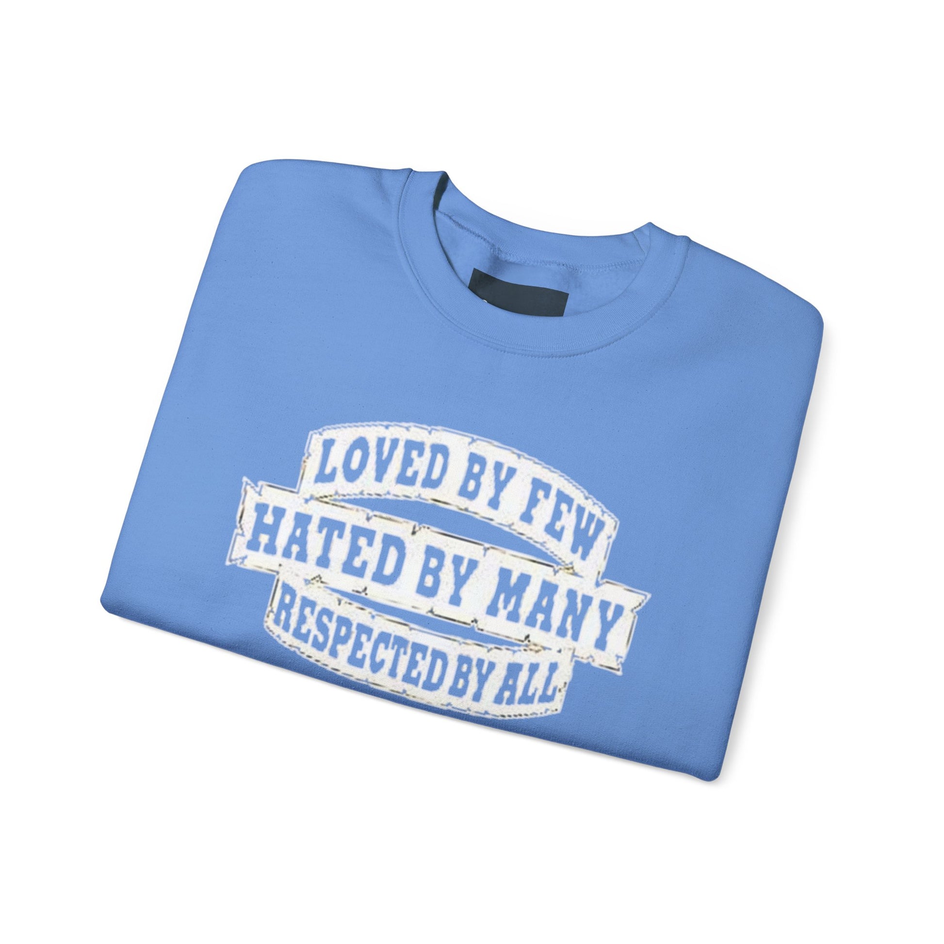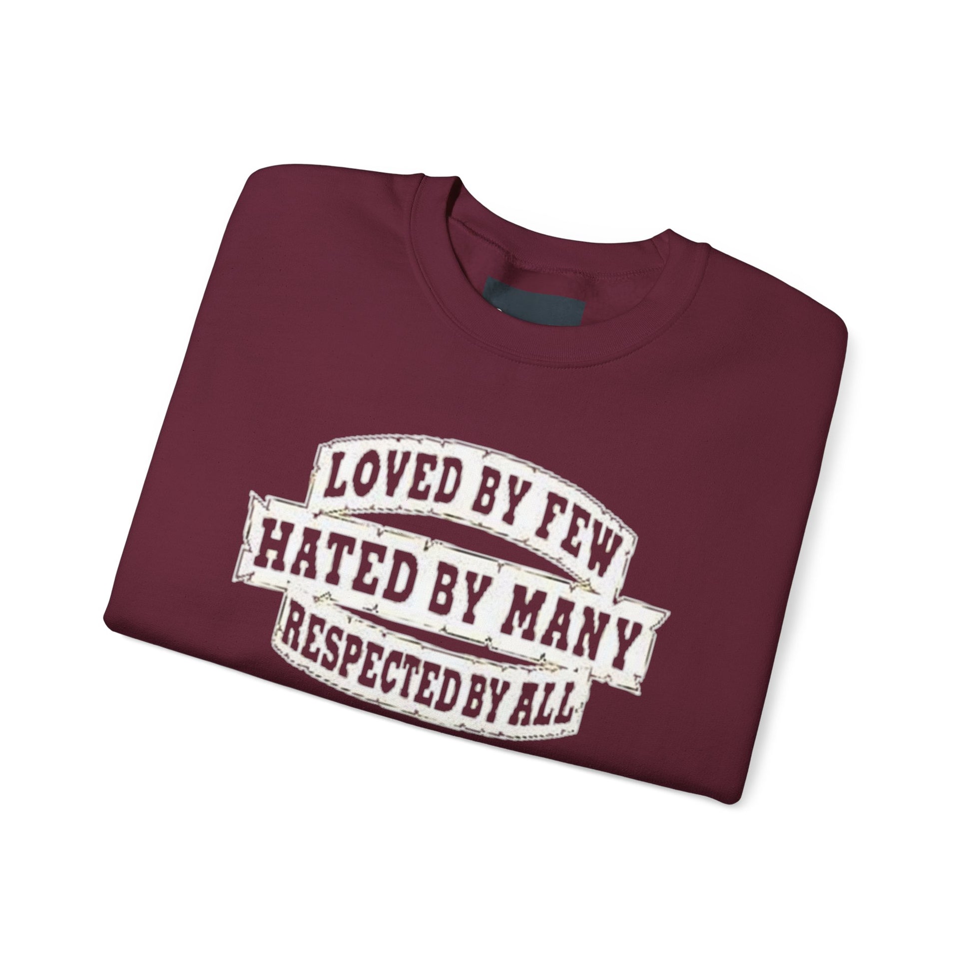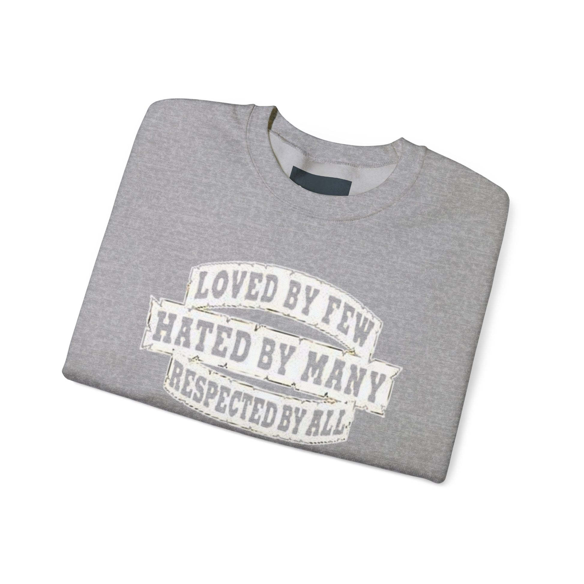 Designed for adults who value comfort and a classic aesthetic, this sweatshirt features a timeless crew neckline and a classic fit that complements all body types. Whether you're celebrating a cozy winter holiday, a casual birthday bash, or just unwinding on a chilly evening, this crewneck has got you covered. Its unique message, "Loved by Few, Hated by Many, Respected by All," adds a powerful statement to your everyday look, making it a fantastic gift for friends or family who embrace individuality.
