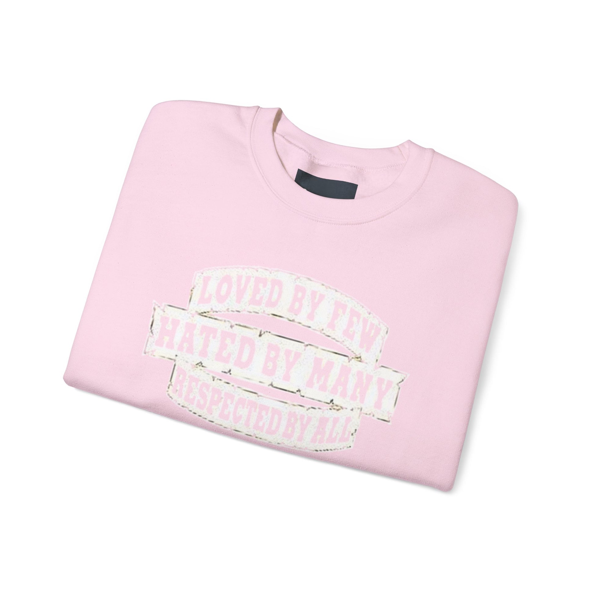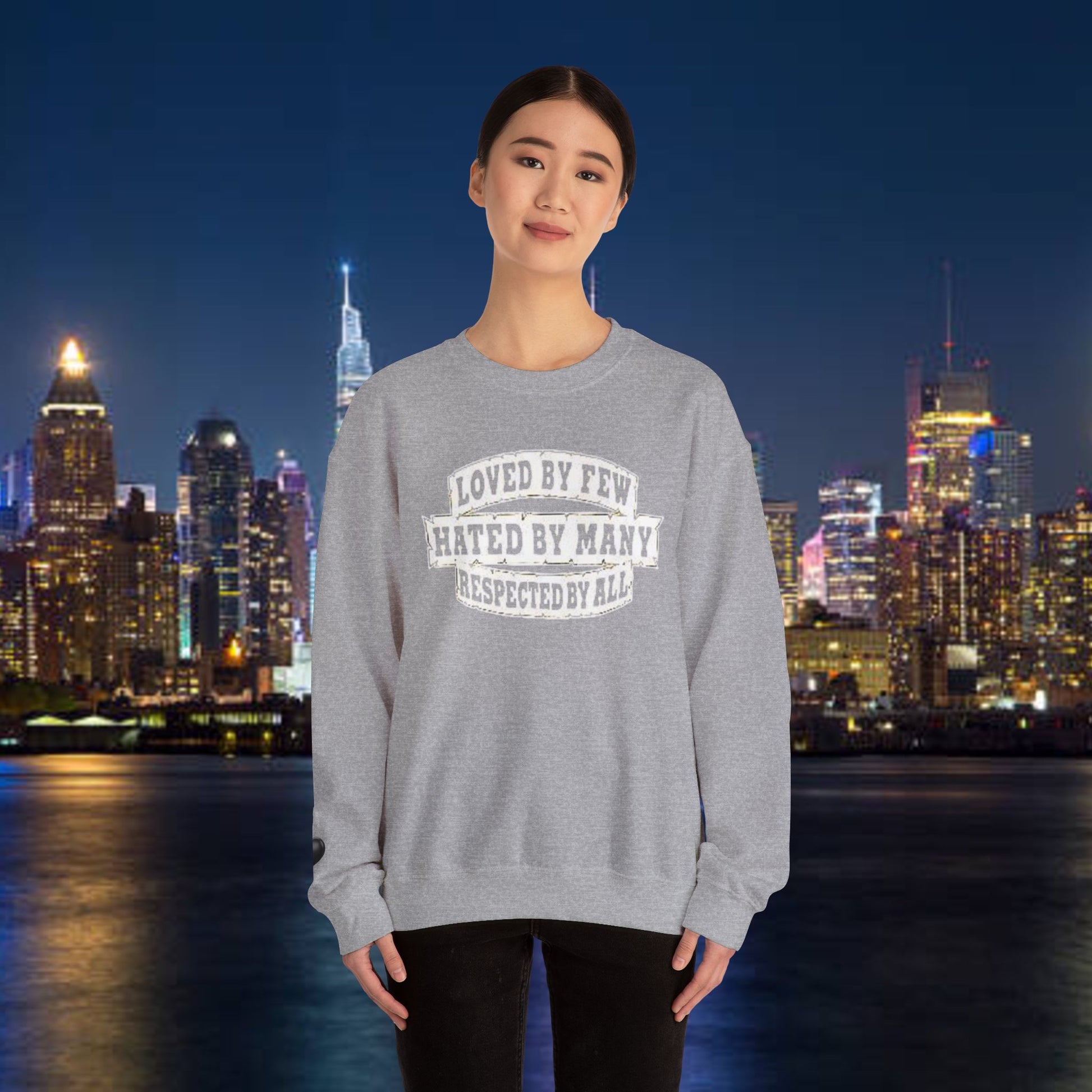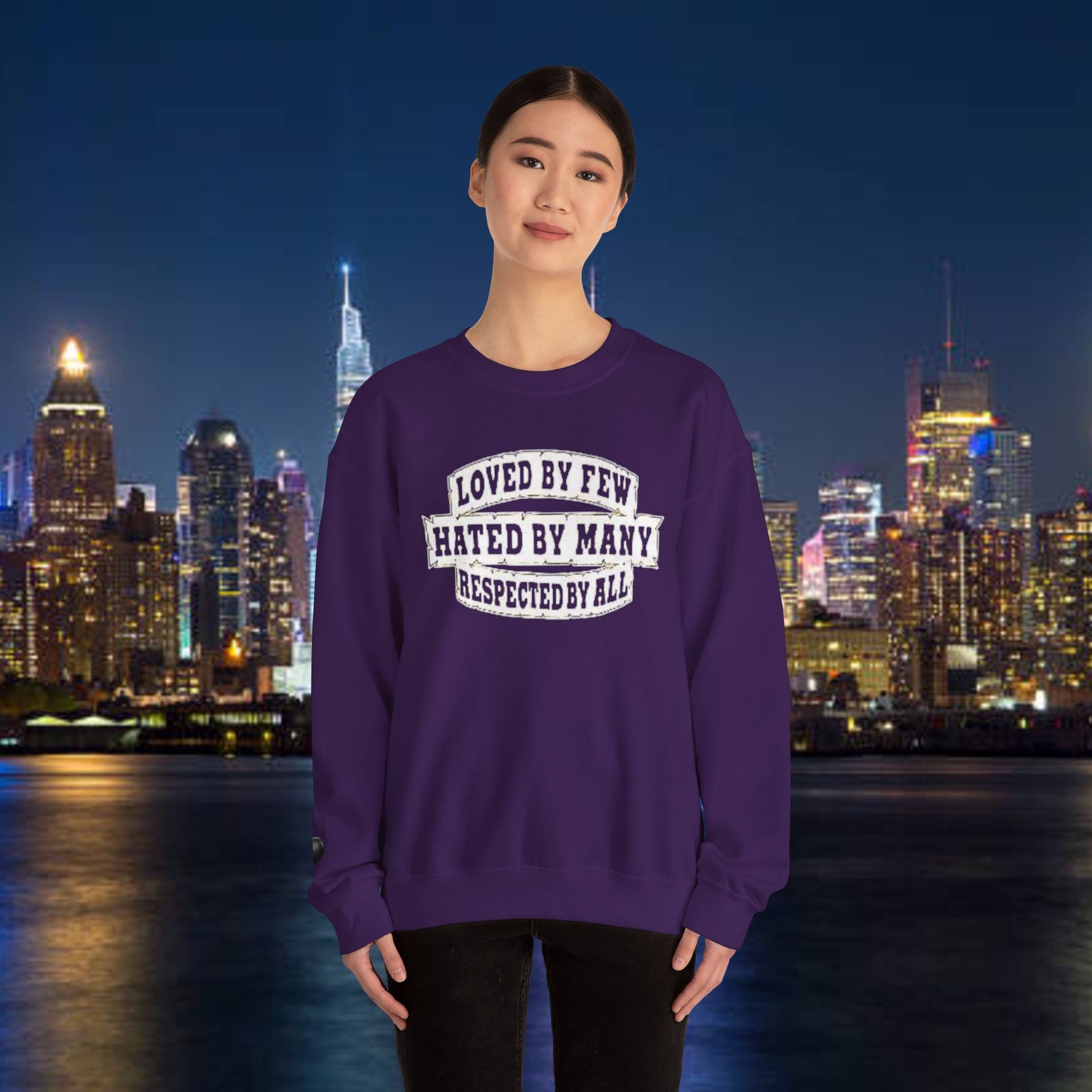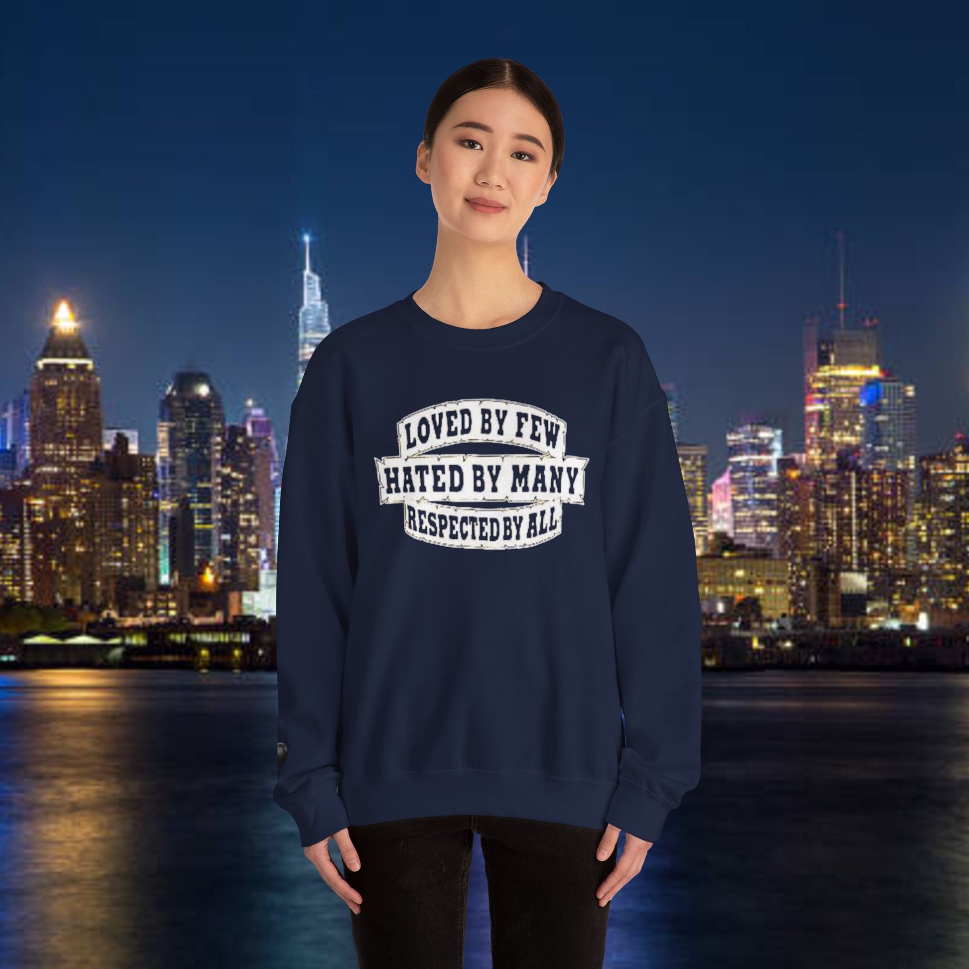 Designed for adults who value comfort and a classic aesthetic, this sweatshirt features a timeless crew neckline and a classic fit that complements all body types. Whether you're celebrating a cozy winter holiday, a casual birthday bash, or just unwinding on a chilly evening, this crewneck has got you covered. Its unique message, "Loved by Few, Hated by Many, Respected by All," adds a powerful statement to your everyday look, making it a fantastic gift for friends or family who embrace individuality.