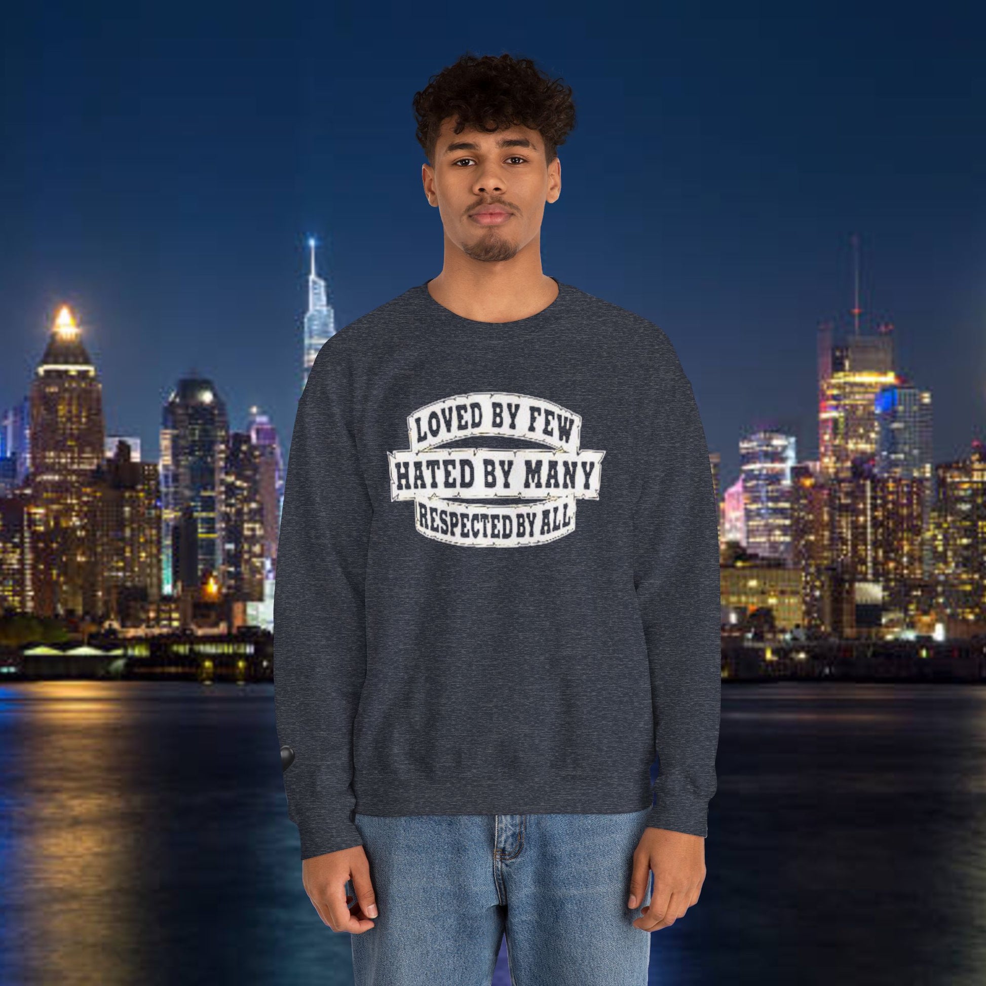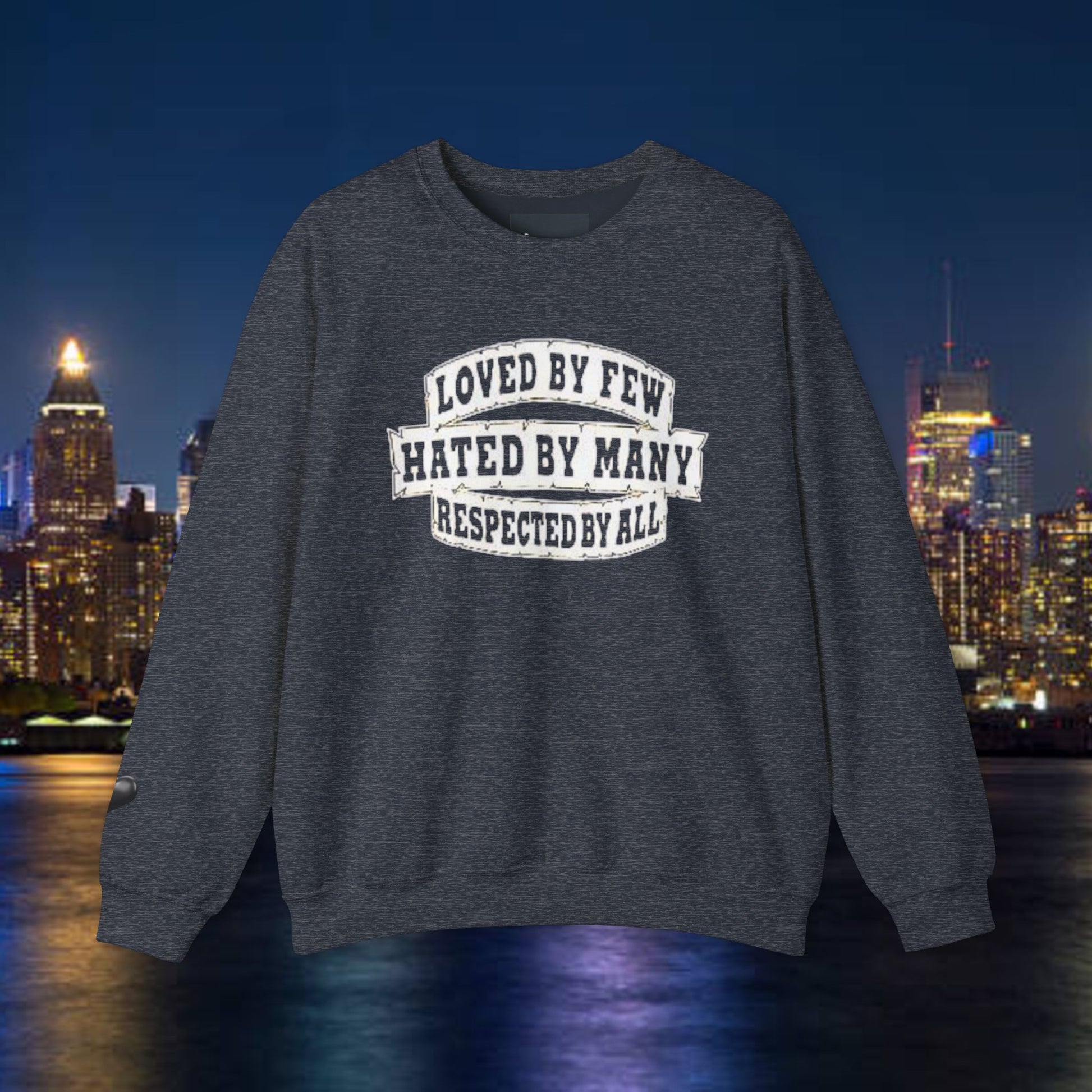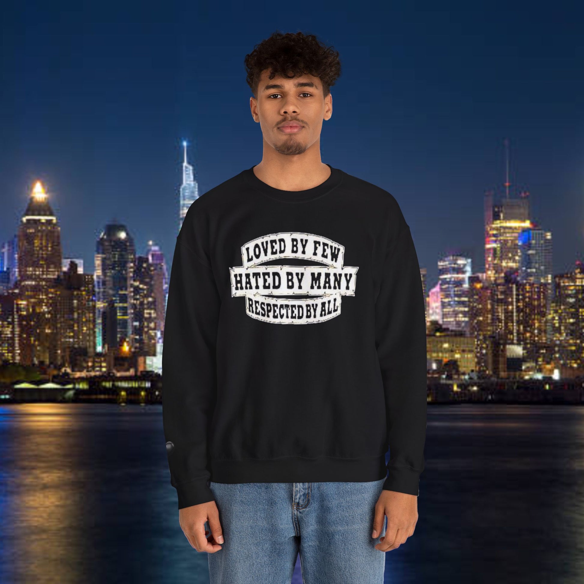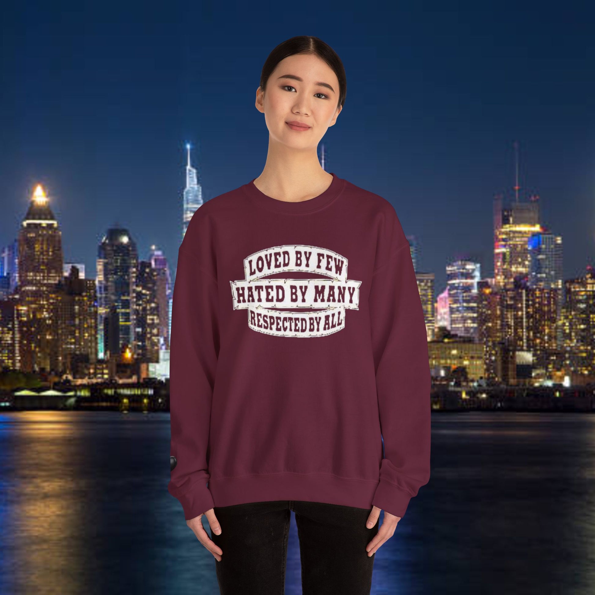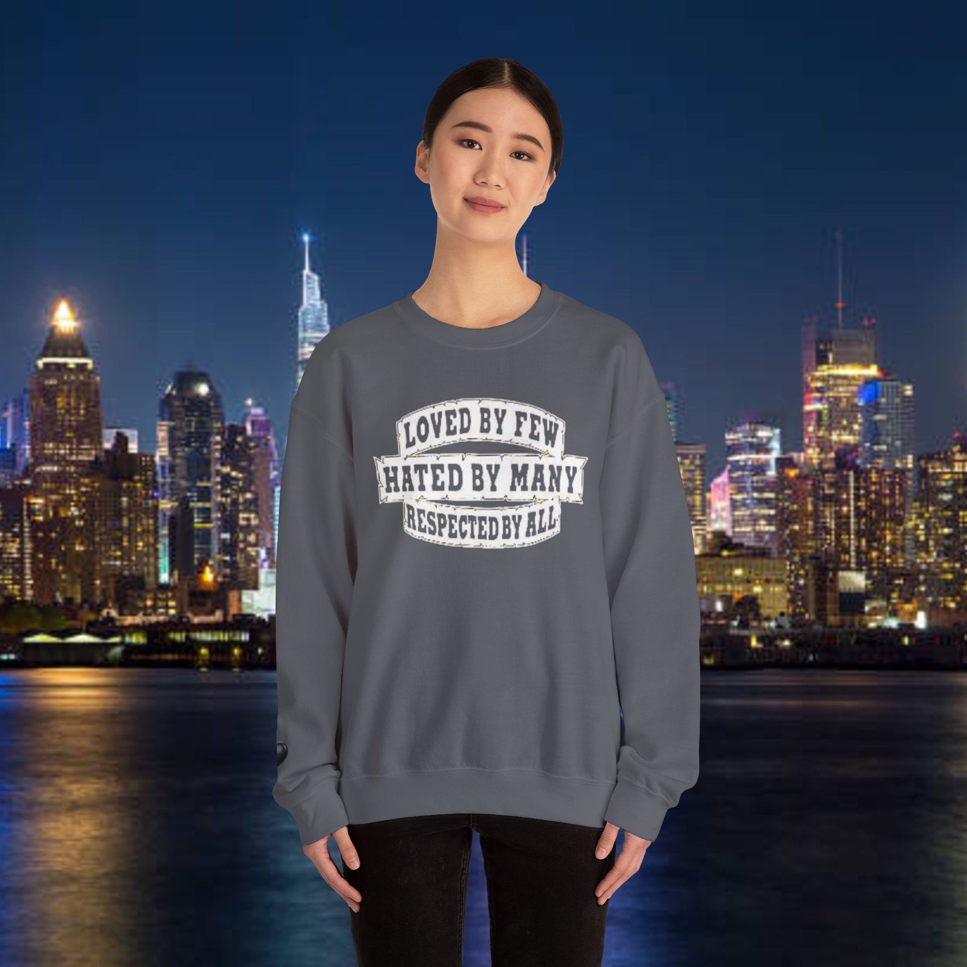 Designed for adults who value comfort and a classic aesthetic, this sweatshirt features a timeless crew neckline and a classic fit that complements all body types. Whether you're celebrating a cozy winter holiday, a casual birthday bash, or just unwinding on a chilly evening, this crewneck has got you covered. Its unique message, "Loved by Few, Hated by Many, Respected by All," adds a powerful statement to your everyday look, making it a fantastic gift for friends or family who embrace individuality.